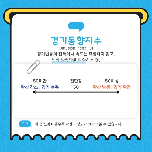 이는 경기의 국면 및 전환점을 식별하기 위한 지표로서 경기확산지수(diffusion index : DI)라고도 합니다.