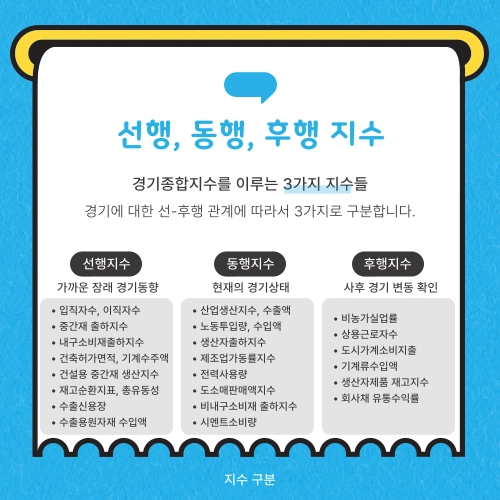 경기종합지수는 경기에 대한 선-후행 관계에 따라서 선행종합지수(선행지수), 동행종합지수(동행지수), 후행종합지수(후행지수)로 구분합니다.